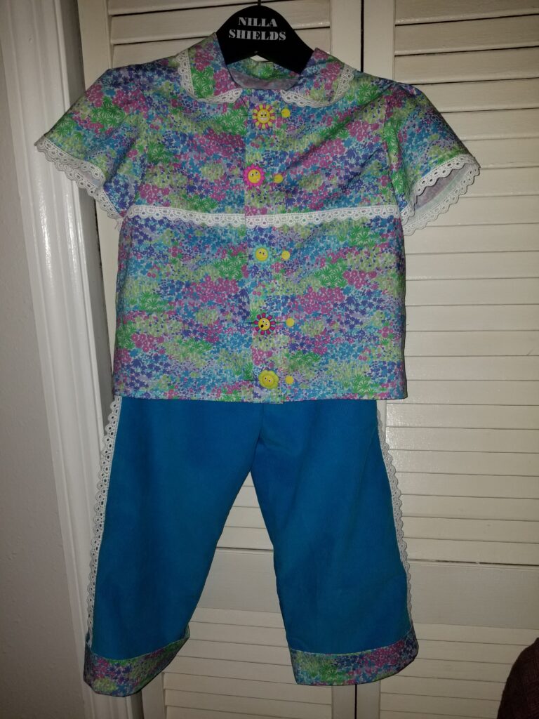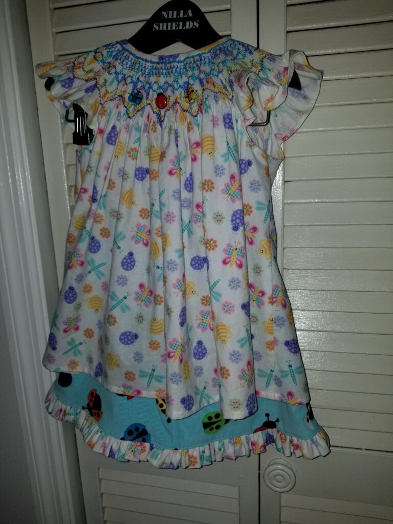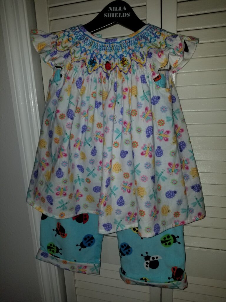 Smocked Ladybug top with corduroy skirt and pants.